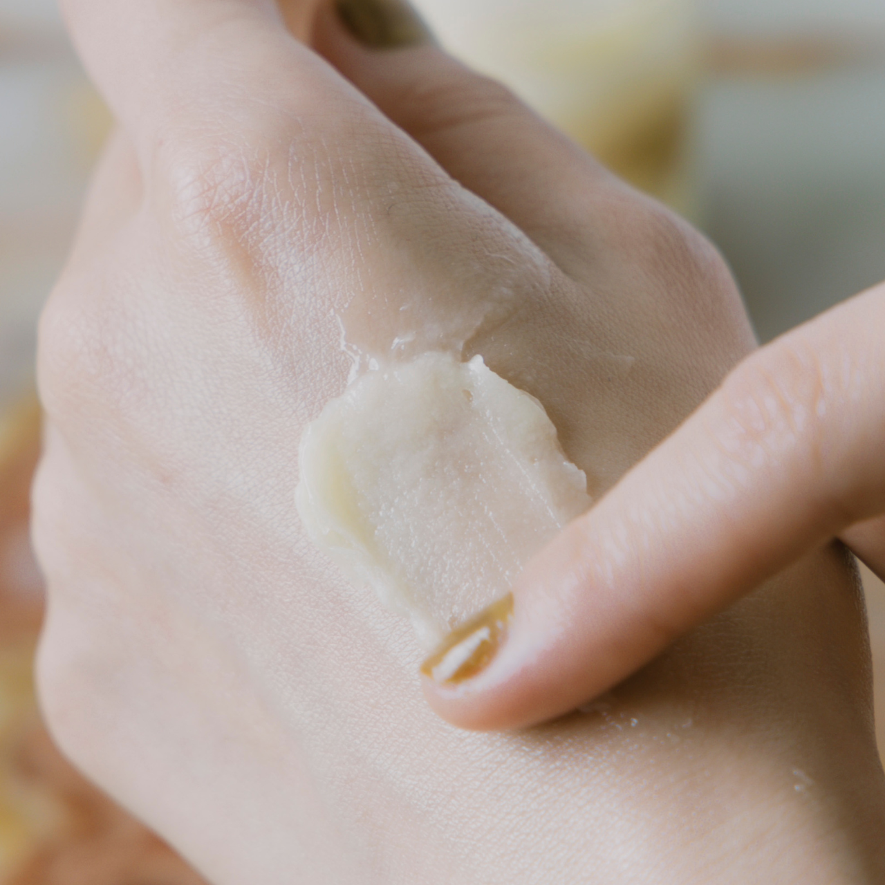 バームを手の甲から広げ、手のひらの順で馴染ませます。